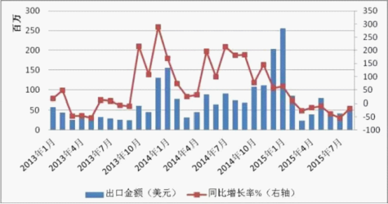 图表 1 2013-2015年我国光伏产品对英国出口情况![]()