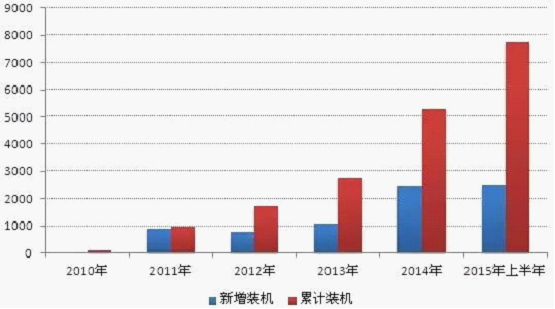 图表 2 2010-2015年上半年英国光伏太阳能装机情况