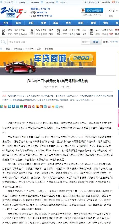 中国信保常州办事处成立于2004 年,8 年间我市出口信用保险从零起步,在自身实现超常规跨越式大发展的同时,促进了企业出口由简单保守的“低档产品、现金交易”逐步向国际通行的“高档产品、信用交易”过渡,形成了我市外经贸新的竞争力。该办事处成立之初,支持我市外贸出口仅600 多万美元,到2011 年已达41.8 亿美元,8 年间增长620 倍、年均增长150%。8 年来,出口信用保险累计支持我市出口达106 亿美元,帮助企业开展信保融资超过16 亿美元,为出口企业挽回收汇损失3.9亿美元,支付赔款5200 多万美元,提供保单融资便利111 亿美元,业务覆盖全市所有乡镇、街道和开发区。