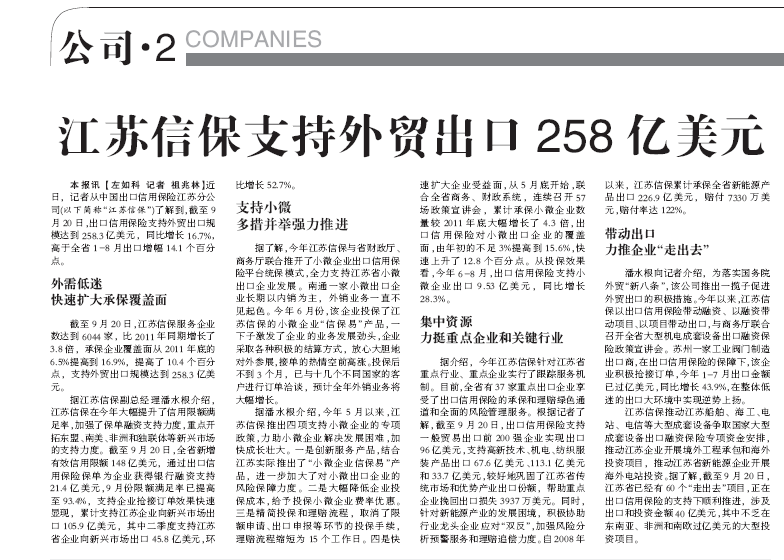 江苏信保支持外贸出口258亿美元——《中国保险报》9月28日02版头条