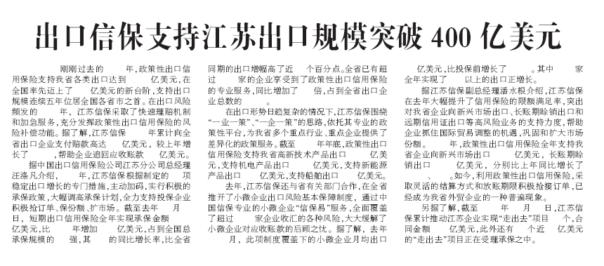 出口信保支持江苏出口规模突破400亿美元——《江苏经济报》2013年1月18日头版报道