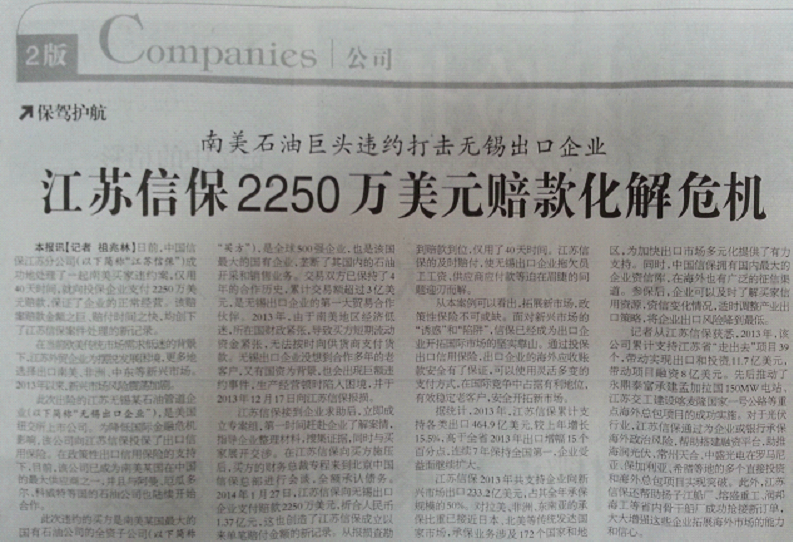 江苏信保2250万美元赔款化解危机——《中国保险报》3月4日要闻版头条报道