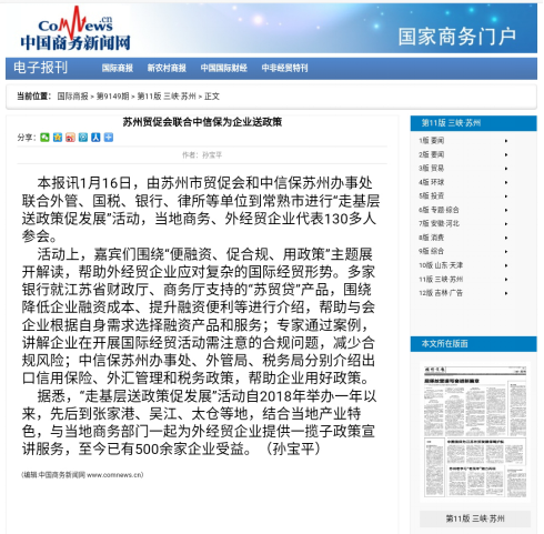 据悉,“走基层送政策促发展”活动自2018年举办一年以来,先后到张家港、吴江、太仓等地,结合当地产业特色,与当地商务部门一起为外经贸企业提供一揽子政策宣讲服务,至今已有500余家企业受益。