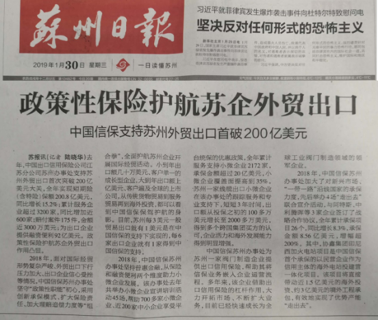 苏州日报:政策性保险护航苏企外贸出口